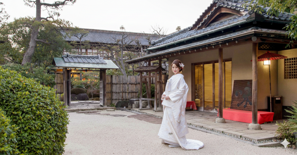 挙式は近くの神社での神前式や旅館の庭園や建物の中で人前式を行うことができます。